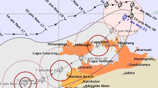 The Tiwi Islands and parts of western Arnhem Land are also within the warning area.