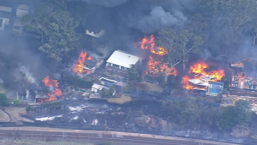 Live video from the network news helicopter shows a bushfire burning houses and trees on Nimbin Road at Koolewong on the Central Coast, south of Gosford.