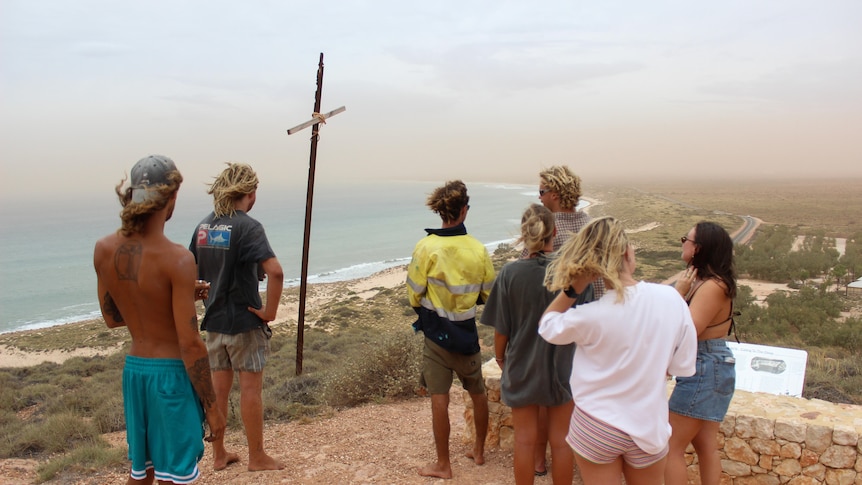 Exmouth residents looking over the ocean as Tropical Cyclone Narelle approaches on Thursday afternoon (ABC News: Bridget McArthur)