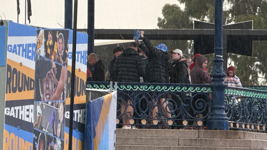 AFL fans seek cover from the rain at Gather Round Footy Festival at Elder Park. (ABC News: Guido Salazar)