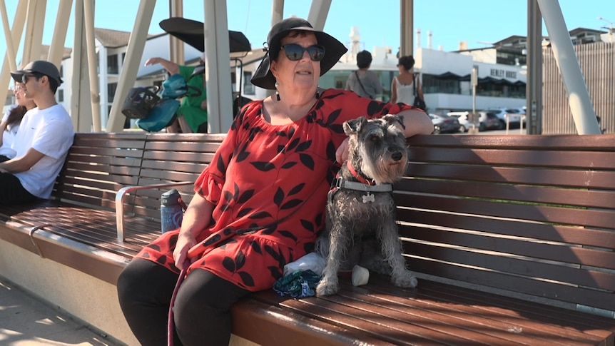 Mary Haywood enjoys a warm April day with her dog at Henley Beach. (ABC News)