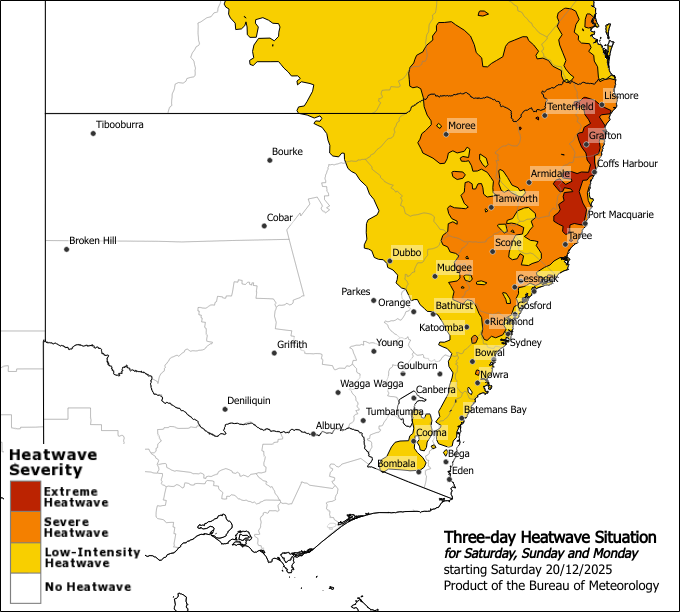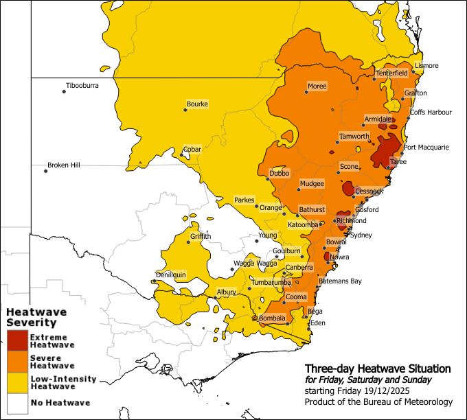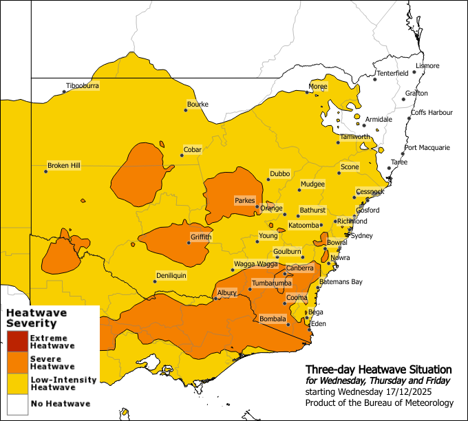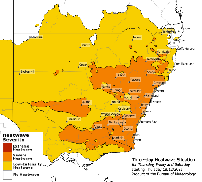 In northern districts expect maximum temperatures in the high thirties to low forties and overnight minimum temperatures in the mid teens to mid twenties. Heatwave conditions are expected to contract to the east over the coming week. About the south and ranges maximum temperatures in the mid twenties to high thirties. Overnight minimum temperatures generally in the mid teens to low twenties. Temperatures continue to decrease over the weekend, with severe heatwave conditions expected ease early next week. Locations likely to be impacted include Sydney, Armidale, Batemans Bay, Dubbo, Goulburn, Moree, Nowra, Orange, Tamworth and Wollongong.