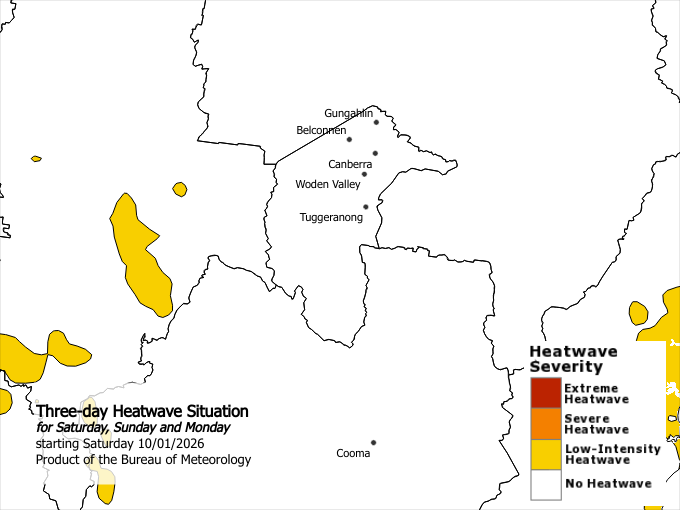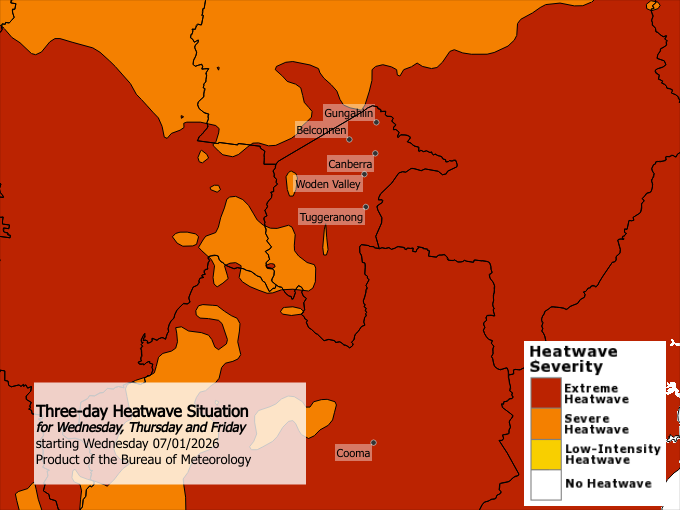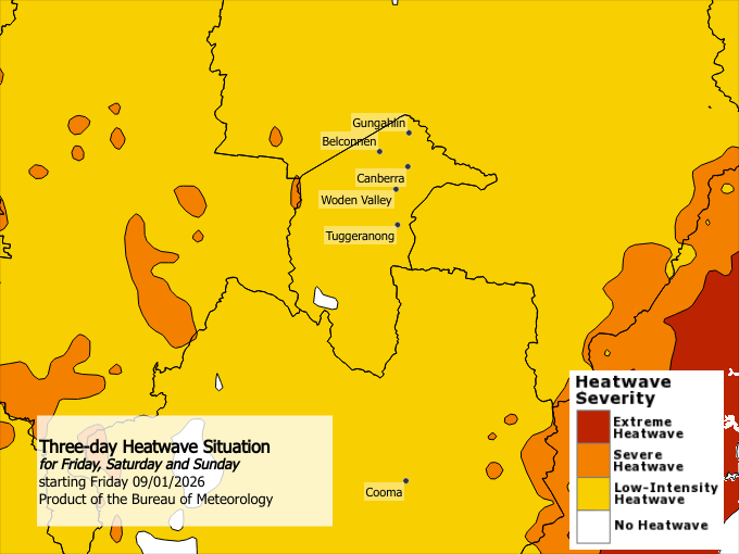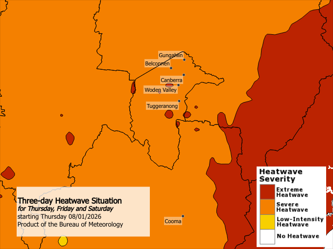 Maximum temperatures in the mid to high thirties and overnight minimum temperatures in the low twenties. The severe to extreme heatwave will ease Saturday night and Sunday as a southwest to southeasterly change brings milder temperatures. Locations likely to be impacted include Canberra, Belconnen, Gungahlin, Tuggeranong and Woden Valley.