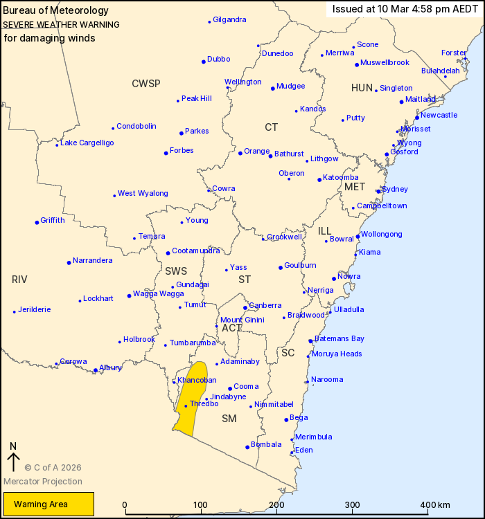 Check https://www.bom.gov.au/weather-and-climate/warnings-and-alerts. Warnings are also available through TV and Radio broadcasts or call 1300 659 210. The Bureau and State Emergency Service would appreciate warnings being broadcast regularly.