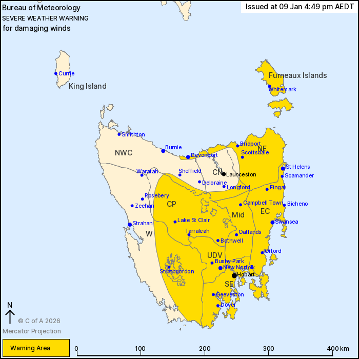 For northeastern Tasmania and the Furneaux Islands: DAMAGING WINDS averaging 55 to 65 km/h with peak gusts around 100 km/h are expected to develop around mid-morning.