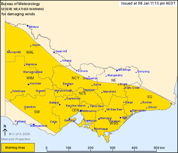 DAMAGING WIND GUSTS with peak gusts around 90 km/h are likely to develop after sunrise on Friday morning about the western, central and eastern ranges, then extend throughout the warning area, including MELBOURNE, from around midday and remain a risk into early Friday evening. DAMAGING WIND GUSTS could reach up to 110 km/h with thunderstorms and over elevated terrain.