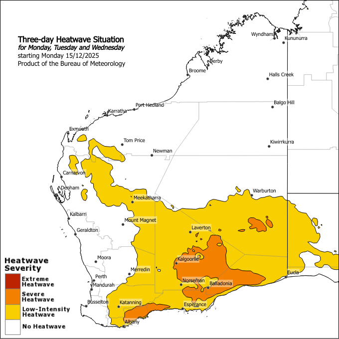 Maximum temperatures in the mid thirties to low forties and overnight minimum temperatures in the high teens to high twenties. Severe heatwave conditions will continue over the southwest before contracting to eastern parts of WA by the middle of the week as a trough moves inland from the west coast. Locations likely to be impacted include Hopetoun, Hyden, Kalgoorlie, Katanning, Lake Grace, Mount Barker, Narrogin, Ravensthorpe and Wagin.
